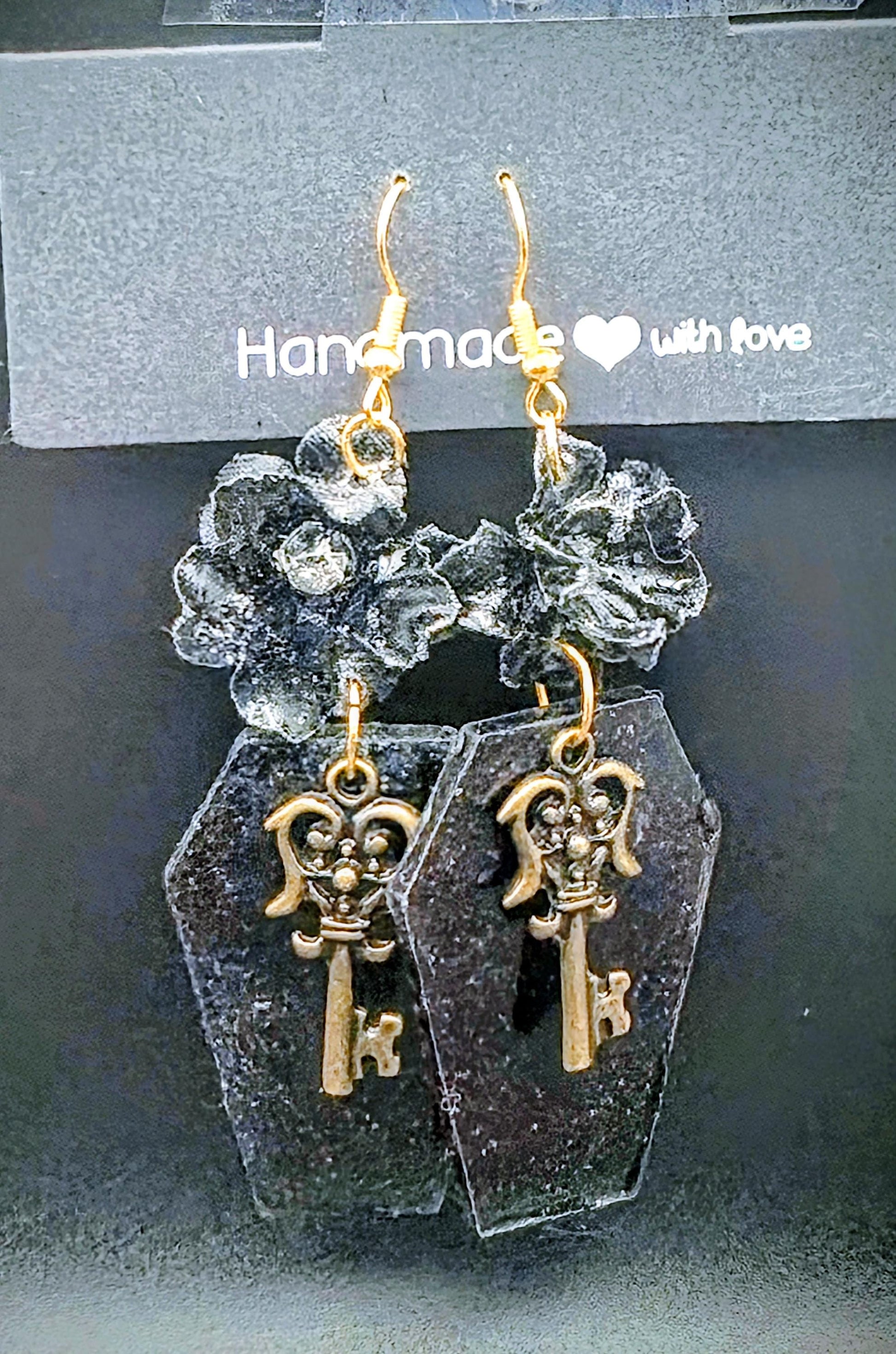 Key to the Crypt Coffin Dangle Boys| Skeleton Key and Black Rose Resin Drop Earrings